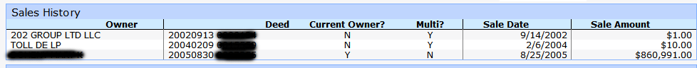 That hasn’t stopped some for pursuing the dream offered by Toll Brothers. The homes at “The Hunt” originally sold for $700k-$850k. Today, 4 years and a real estate meltdown later two of these homes are for sale for over a million dollars. Here’s one listing for $1.125 million. A quick search of public records netted this information: