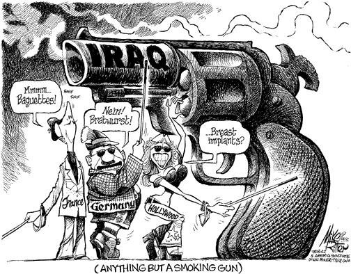 March 19, 2003 9:30 PM ESTThe (dis)information is coming thick and fast, but not fast enough for the news junkies like us with Fox News on two TVs in the house. Since everyone is wondering what will be happening over the next few hours, we thought we would take a look at what won't be happening. - No more "hide the anthrax" with Blix and crew ("Schultz!!!" - see first comments below) - No more crap from Sen Thom Daschell (D - France) or the short & homely Dixie Chick. - No more playing with chipper-shredders for Oday and Qusay - unless they get a thrill from being fed into one themselves - No more crap supposedly from the Pontiff but most likely from the pederasts surrounding him and propping him up Things to look forward to:- A Free Iraq - The phrase "our allies the Iraqis" or "our friends in Baghdad" (useful to fill the gap once taken by the French) - PJ O'Rourke articles in Rolling Stone about the war - Thom Daschell scrambling to get his hands on one of those pamphlets being dropped in Iraq telling him how to surrender - Jacque Chirac explaining to his people the illegal trade in arms to the former Iraqi regime - Chancellor Schroder explaining to his people how Germany supplied poison gas to the former Iraqi regime - Saddam's dead body strung up with piano wire on a lamppost in Tikrit