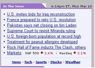 March 17, 2003President Bush has given his ultimatum, and it is clear that the bombs will begin to fall and the armies will clash unless Saddam Hussein suddenly realizes that the game he has been playing with Fate for the last 30 years is finally over. As a member of the so-called "Warblogger" community, I have spent weeks fearing this day as much as wishing for it to come. But contrary to what those on the other side of the debate would have it, there is no rejoicing in my heart. I am fucking scared. I can be sure about is that there are 250,000 men and women on the other side of the planet who believe in our country who no doubt feel the same. It's just that the difference between us is that they are fighting for a cause they believe in with their lives, while all I can do is write my little essays, participate in the democratic process and speak to anyone who will listen. The fearless do not experience courage. Courage is for those who are scared yet do what needs to be done. I saw it on the faces in the video taken during September 11. Seeing grown men, tough men, brave men so obviously scared yet doing their jobs - for some with their last breath... That is courage. And I know that soon those young people in the Middle East are going to wake up, be scared yet do their jobs nontheless. The call to war, the horn that has echoed down through the ages, is ready to sound. For some it will be one of the last sounds they hear. There is no glory to be had in Iraq just like there is no glory to be had in putting out a fire or hauling hoses up the smoke filled stairs of the World Trade Center. In a sense Iraq is a fire, and the debate over the past few years has been how big a fire it is. France thinks that it is a containable fire; the "protesters" think that the fire is candle light and are drawn to it like moths. However the United States and its allies recognize the fire for what it truly is, an inferno that threatens to burn down its neighborhood and ours as well. It must be dealt with now while we still can put it out - or it will have to be put out later, at greater cost in lives. Just because we want to act now doesn't mean that we enjoy war and killing. It's quite the opposite really. I believe that all people have a right to freedom and that no one deserves to be oppressed. I also believe that not every one believes as I do, and recognize that there are some men who attain power who believe that everyone exists to serve them and will kill anyone who dares to stand in the way of the fulfillment of that belief. I believe that these men must be removed from power by any and all means. Saddam, the worst tyrant of recent history will soon join Pol Pot in Hell or Idi Amin in exile. Kim il-sung should watch carefully how this is done - as should any one who threatens the people of the United States. March 12, 2003I was going to write something extremely nasty about Chrissie Hynde over her recent traitorous remark until I mentioned it to an extremely young colleague of mine: "Didn't she sing 'Hey Mickey!'?" he asked. Out of the mouths of babes... March 11, 2003Headline Fun strikes back!You gotta love those French. They're preparing to veto the US resolution while we're soliciting bids for Iraqi reconstruction. One country lives in the past, another prepares for the future. Is it any wonder why France hasn't been a superpower in close to 200 years? It appears I was right about Blix. He tried Blixing the Security Council by burying the discovery of an undeclared un-manned chemical weapons "crop duster" in the 173 page addendum to his speech. "Those stupid Americans will never read it," he must have thought. Pity the poor bastard whose task it was to do so. But s/he discovered something truly amazing: see the Fox News headline from yesterday's post. It has been clear for years to many that the United Nations has been subverted to be used as a tool against the United States. It should now be clear to everyone. Hans Blix and the inspectors do not intend on disarming Saddam; they intend to restrain the United States. They're actions place American soldiers at risk in Kuwait, and since these weapons may be used by terrorists in the USA, place Americans at risk in their homes. One is left with the following conclusion: The United States should leave the United Nations immediately.March 10, 2003More headline fun.... These headlines were being reported at the same time...CNN: